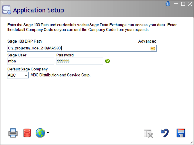 Enter the password for the Sage User that is indicated. If the Sage User and Password is correct, the system will display a check box to the right. Otherwise, if the user and password is incorrect, path to Sage 100 is incorrect, or the permissions to Sage 100 are wrong, a warning icon will display.
